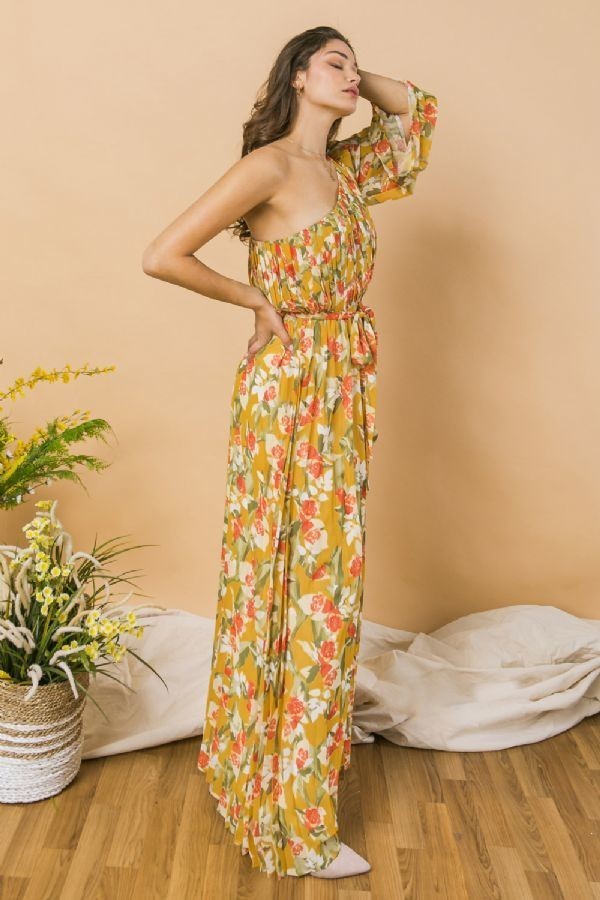 A printed woven one shoulder maxi dress featuring angel sleeve, elasticized waist with self sash tie and full pleated body