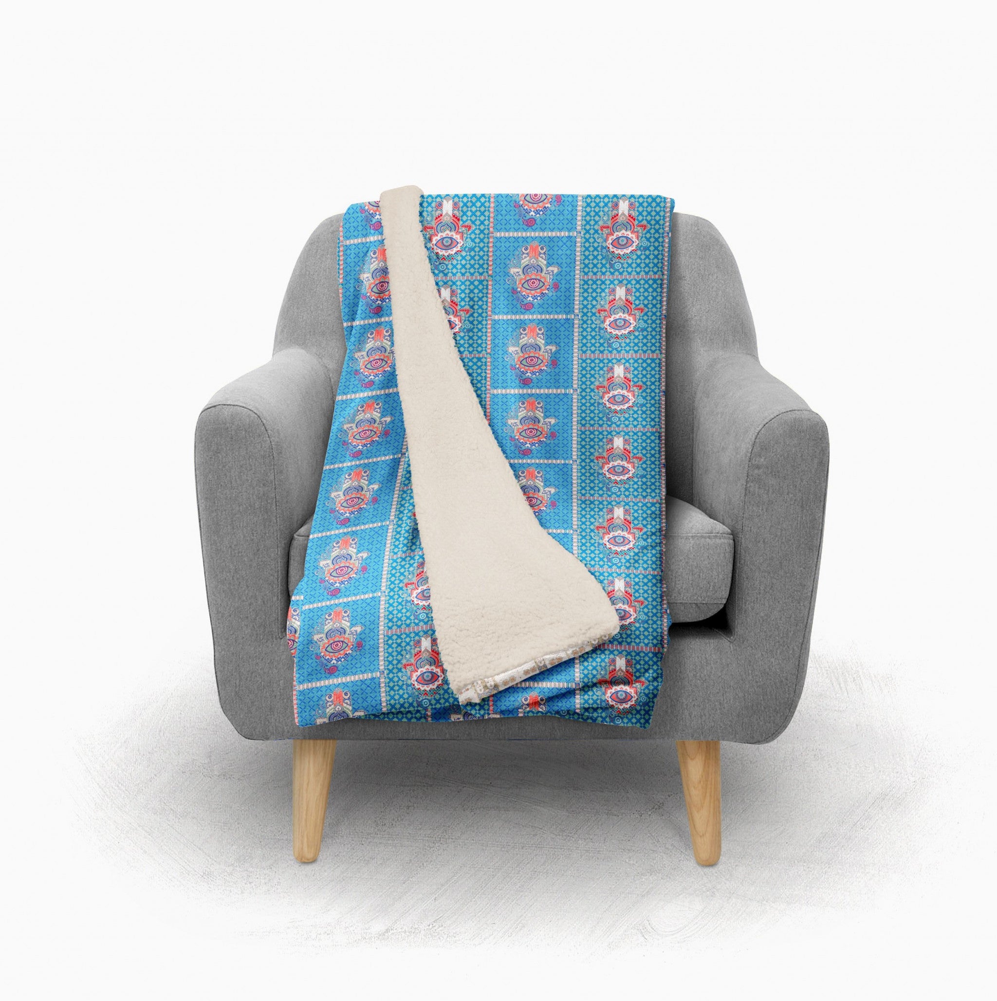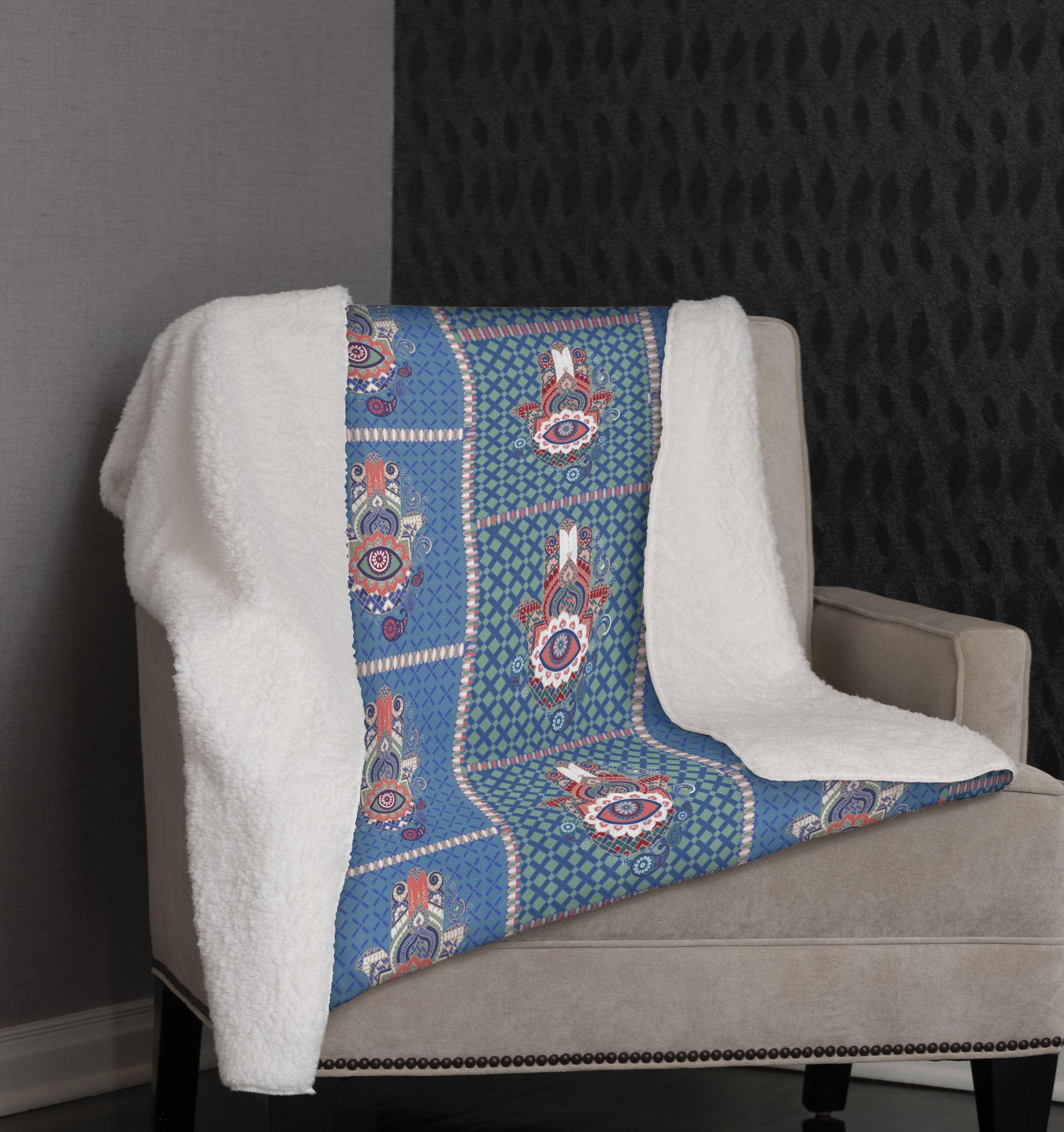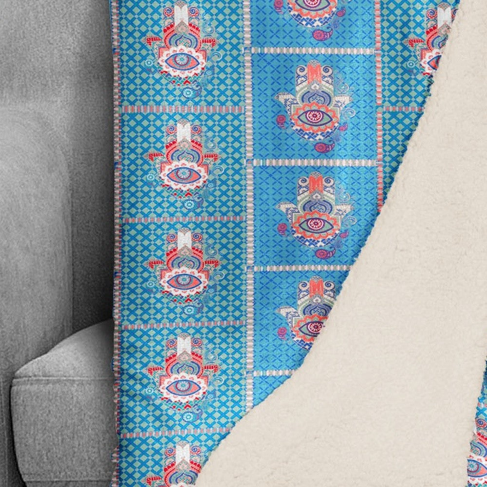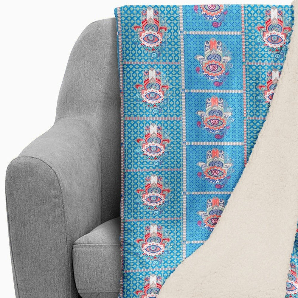 Aqua Hamsa Patchwork Fleece and Sherpa Throw Blanket