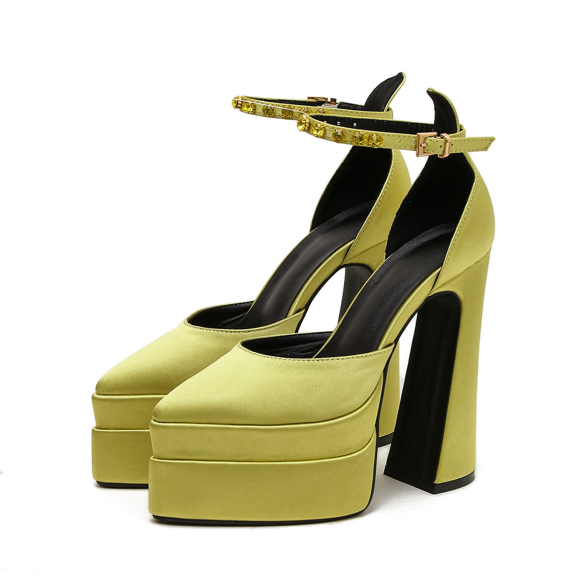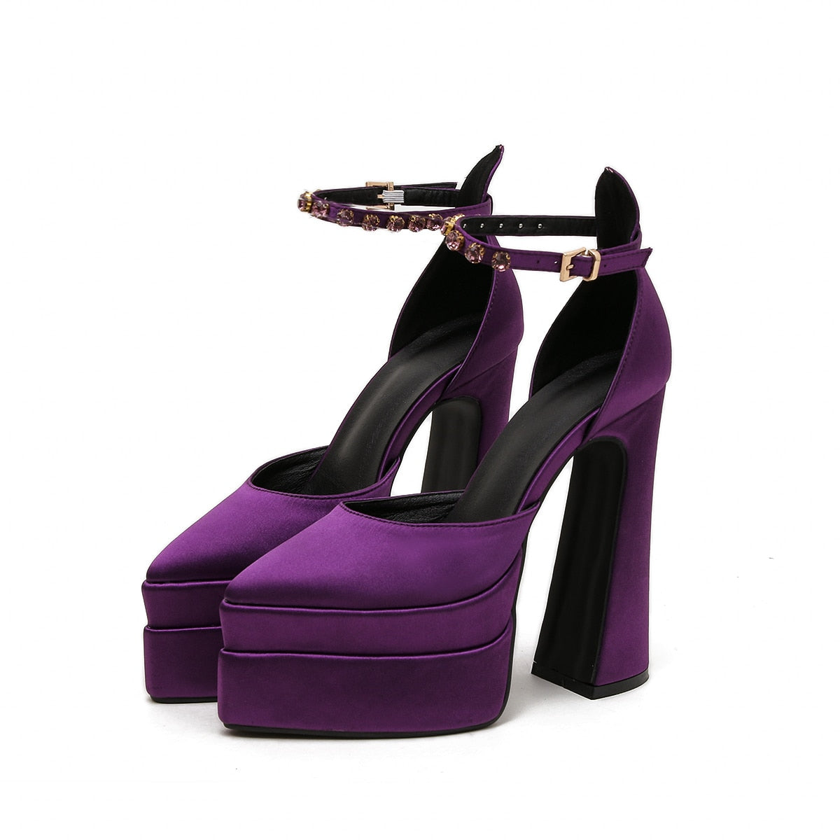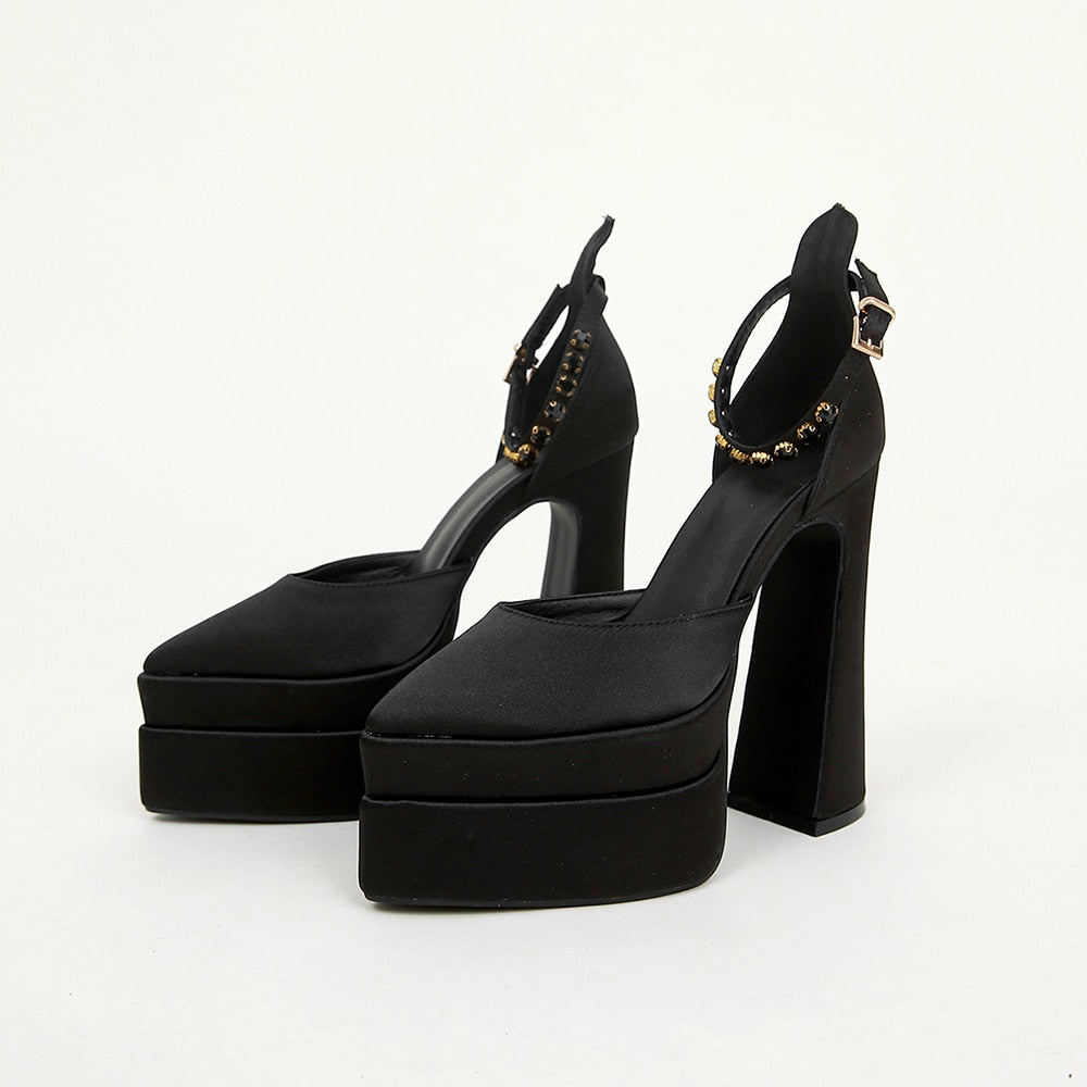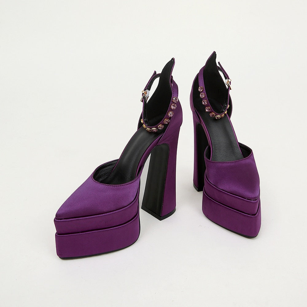 Brand Double Platform Block Heel Women High Heeled Shoes Satin Rhinestone Wedding Party Cool Sandal Chaussure Femme Luxe Marque