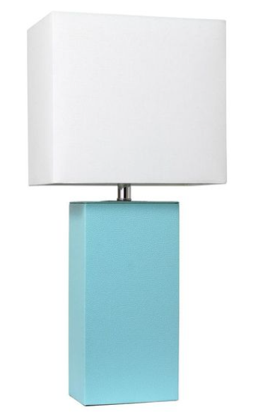 This fashionable table lamp, with its leather body and white fabric shade, will add style and pizzazz...