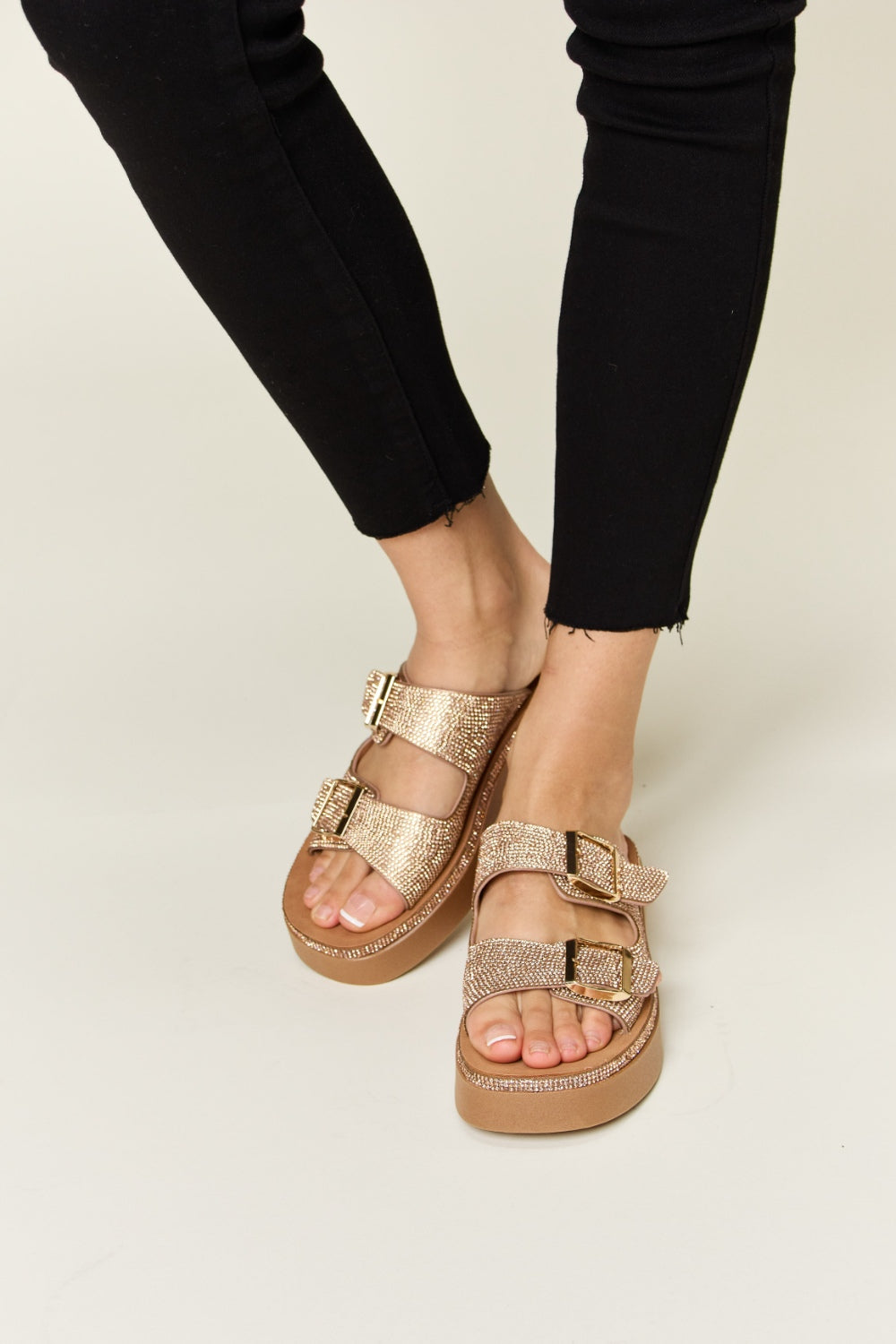 The Rhinestone Buckled Wedge Sandal is the perfect combination of glamour and comfort. The shimmering rhinestone details add a touch of sparkle to any outfit. The wedge heel provides added height while remaining easy to walk in. The buckle closure ensures a secure fit, allowing you to wear these sandals all day long. Whether you're dressing up for a special occasion or adding a bit of glam to a casual outfit, these sandals will make a statement. Elevate your look with these stunning rhinestone-embellished wedge sandals that are sure to turn heads wherever you go.