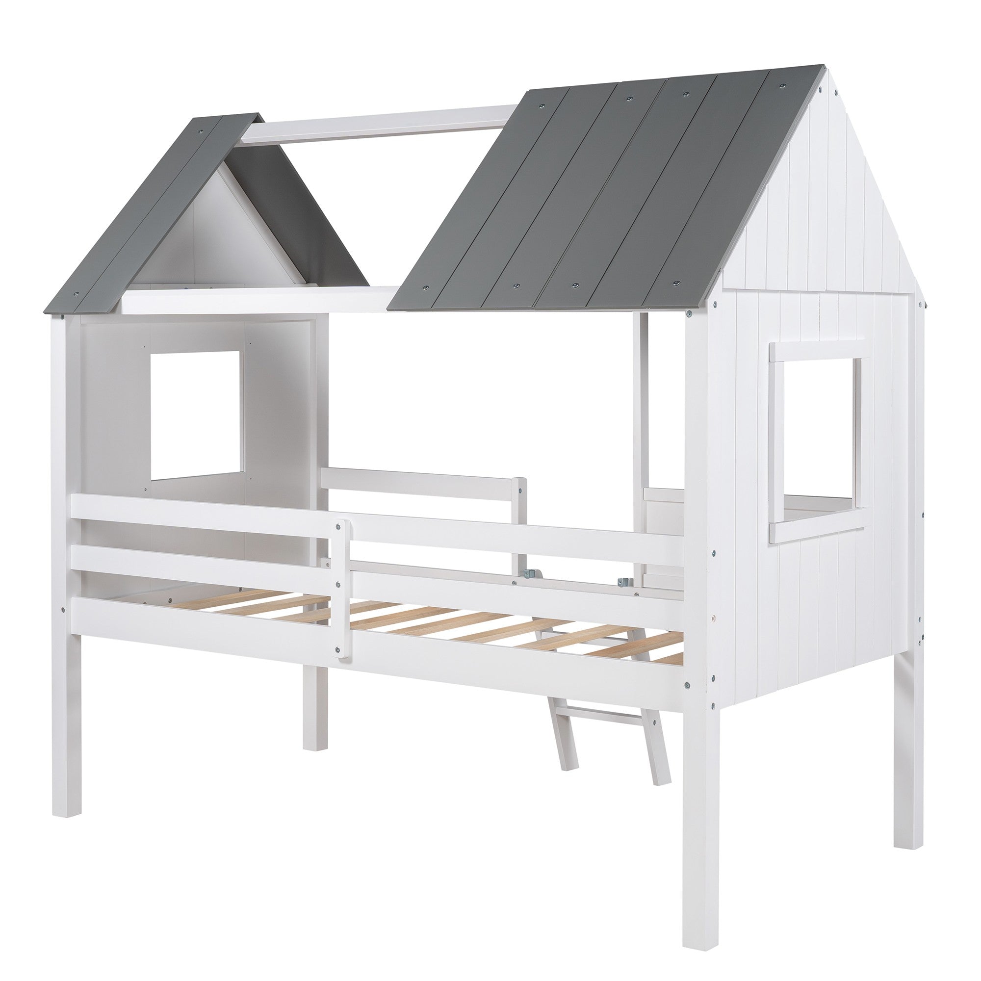 Charming and playful, the Gray + White Twin-Size Loft House Bed w/ Side Windows is an awesome...