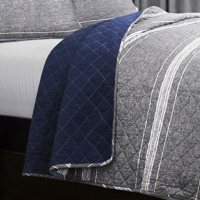 King Gray Navy Stripe Motif 100% Cotton Reversible Quilt Coverlet Bedspread Set