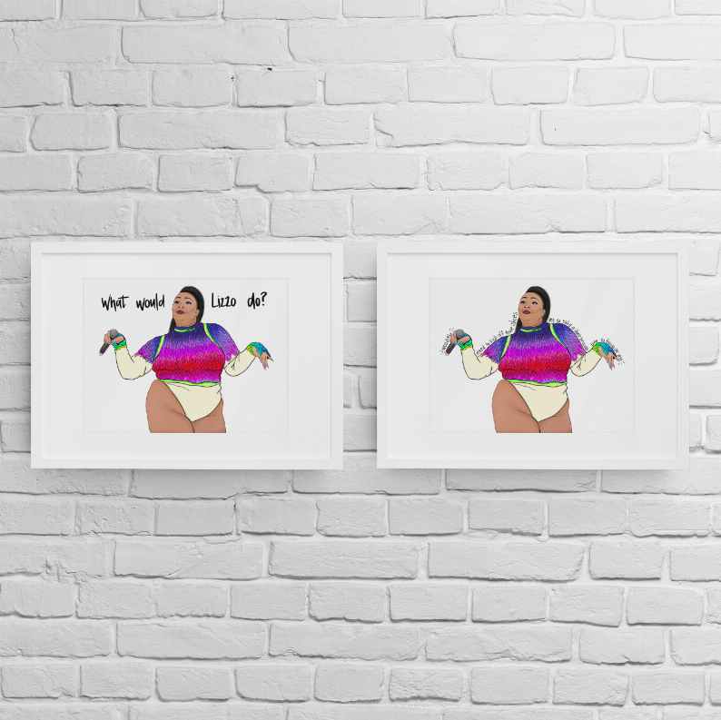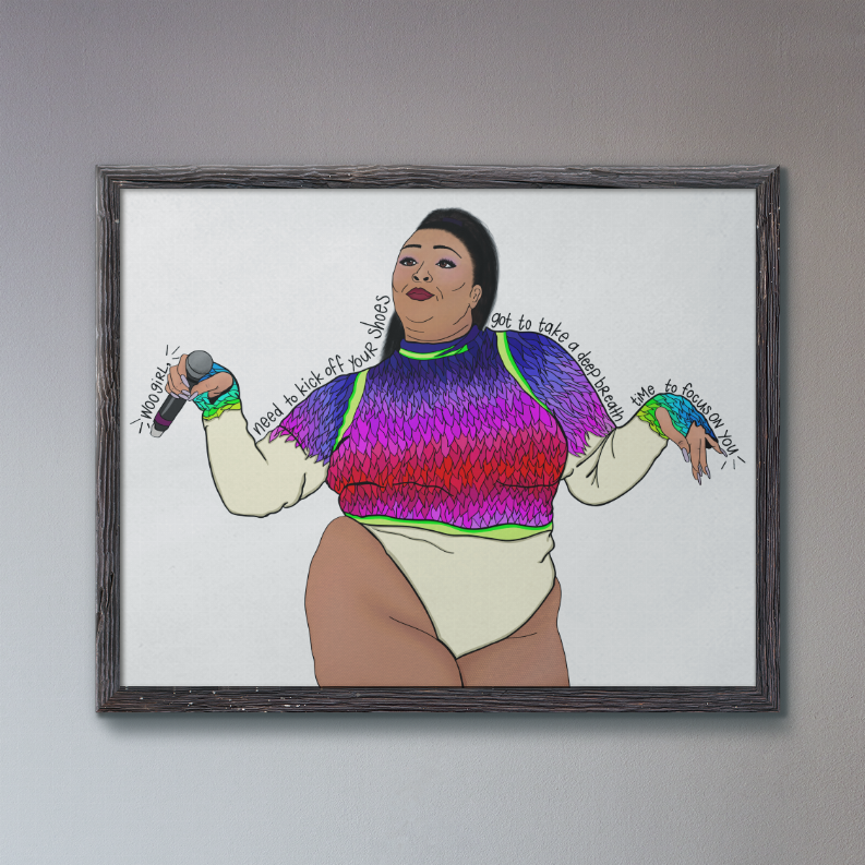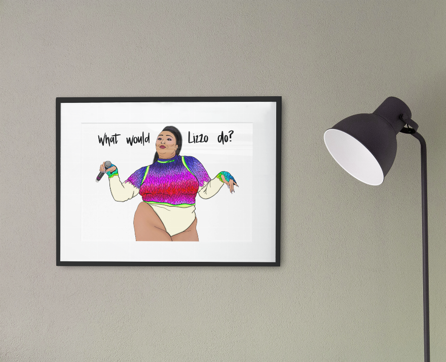 Choose between "What Would Lizzo Do?" and lyrics from the song "Good As Hell" - Woo girl, kick off your shoes. Got to take a deep breath, time focus on you."