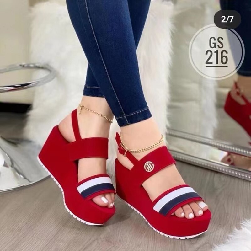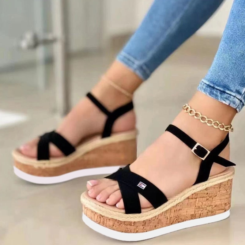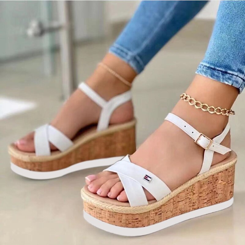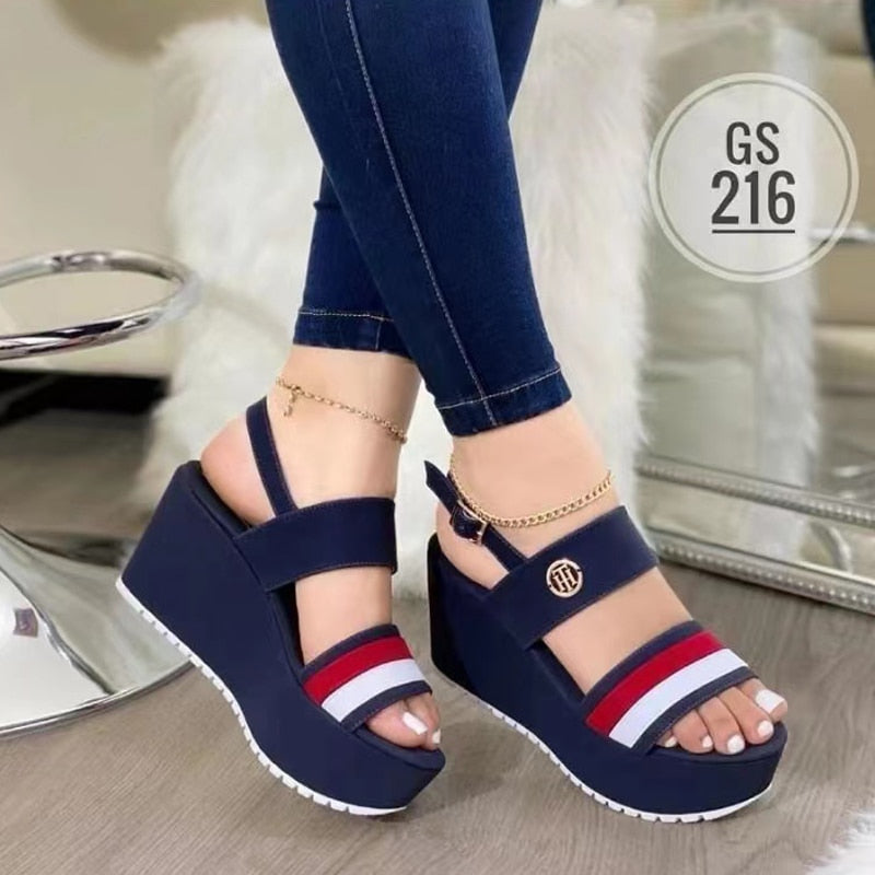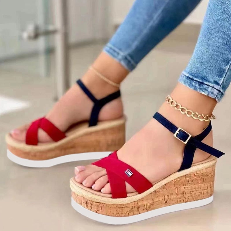 New Wedge Heel Thick Sole Ladies Sandals Summer Set Foot Color Matching Fashion Word Buckle Roman Casual Women's Shoes
