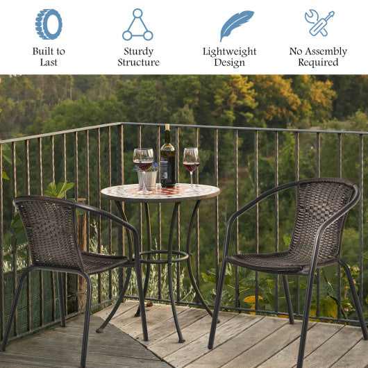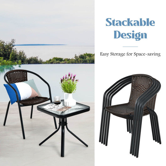 -Ergonomic design ensures comfortable sitting-Weather-resistant materials for great durability-Stackable design for easy and space-saving storage-Woven sculpted look...