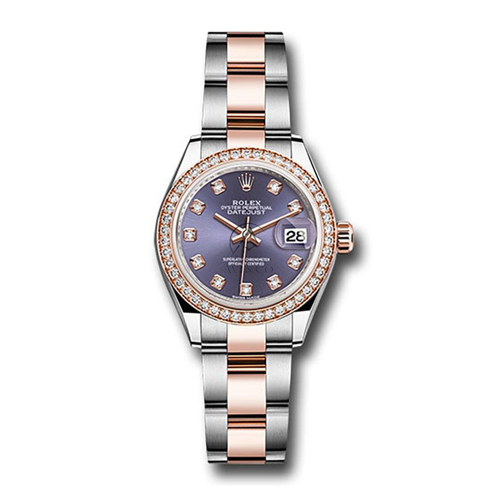 The Lady Datejust 28 is a charming watch with aubergine diamond dial that strikes the perfect balance between romantic and functional. The two-tone rose gold and steel 28 mm case is assembled with a diamond bezel and screw-down crown. This timepiece is powered by the 2236 caliber with a 55-hour power reserve.