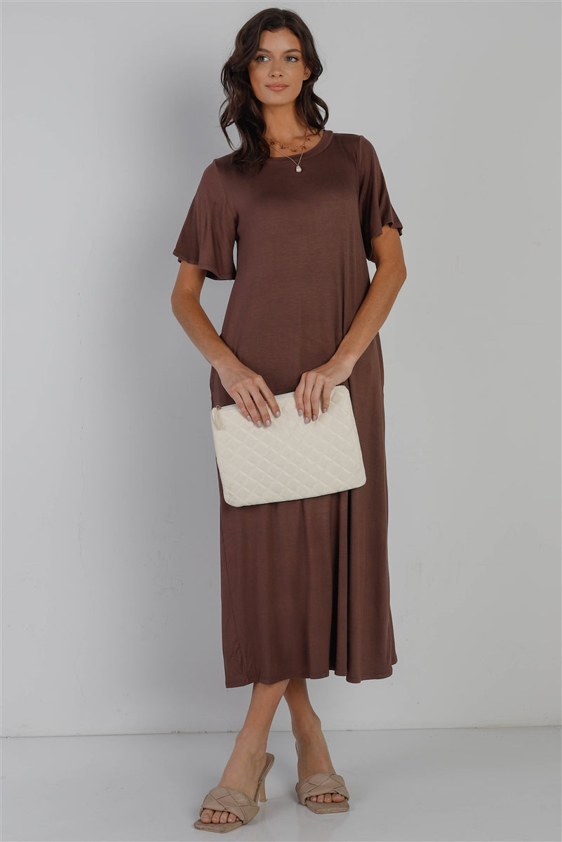 solid color, crew neckline, short sleeves, two side pockets, midi length, relaxed fit, unlined, stretchy, non-sheer, casual, cute, trendy, stylish, everyday look