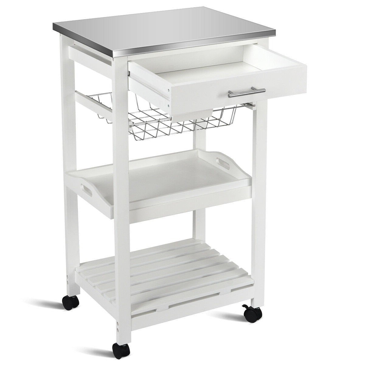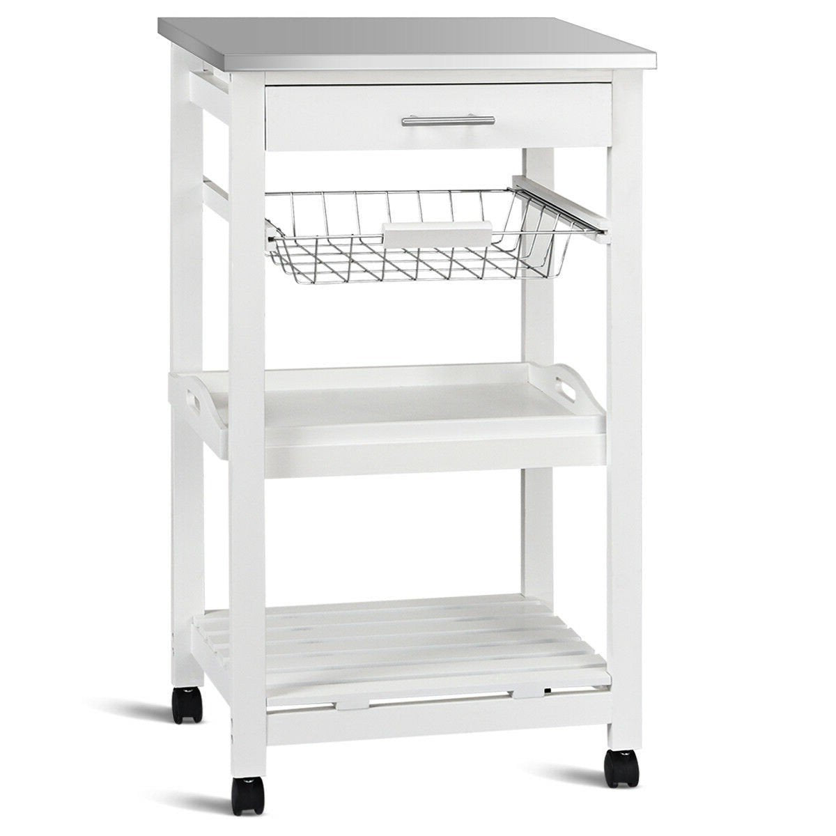 White Kitchen Cart with Storage Drawer and Stainless Steel Top